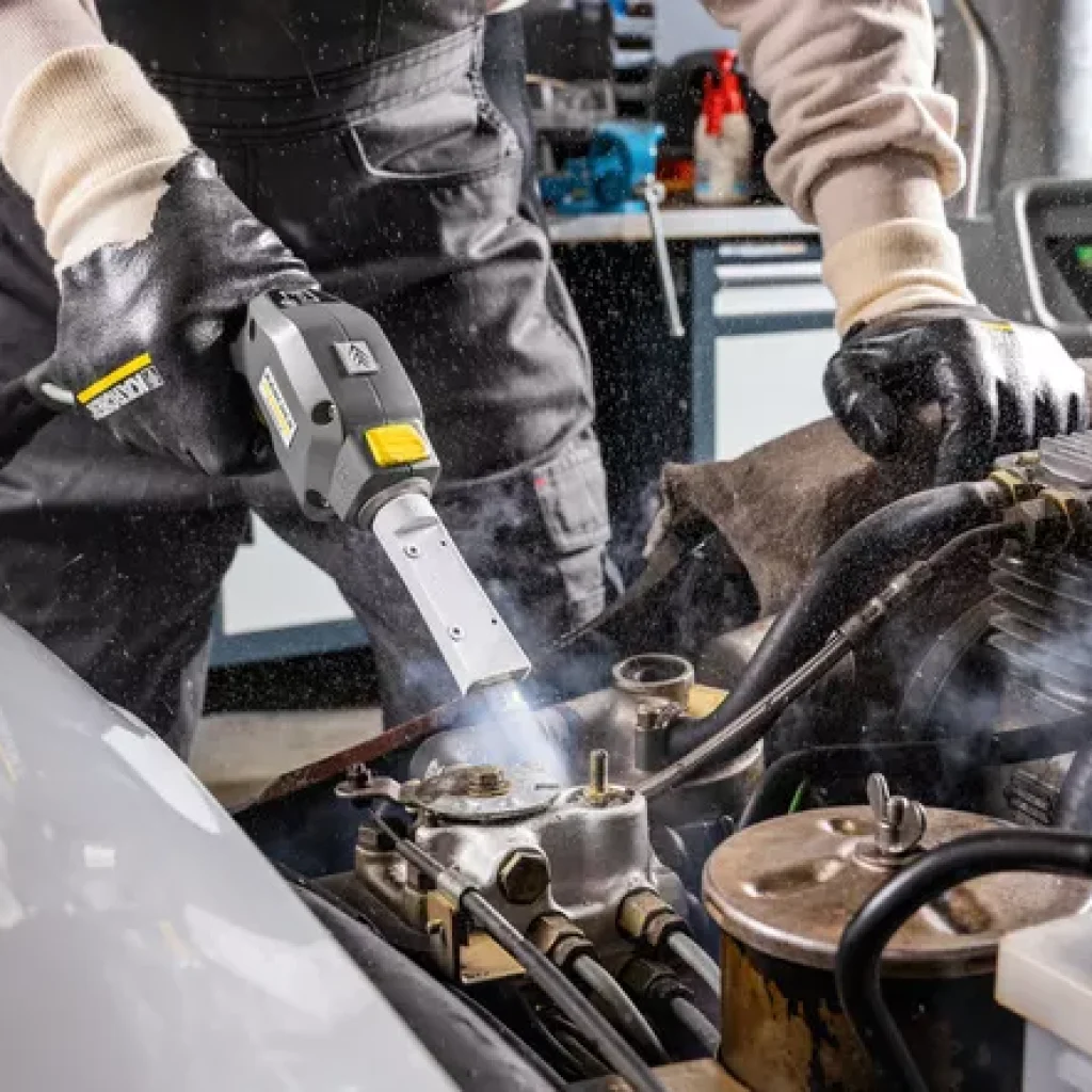 O sistema de limpeza com gelo seco da KÄRCHER utiliza ar comprimido e pellets de gelo seco para remover resíduos de borracha, óleos, gorduras, agentes separadores, tintas, entre outros, de peças de trabalho ou superfícies.